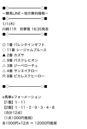 2026年1月1日(木)元旦から無料予想で的中を届けてもらいました!