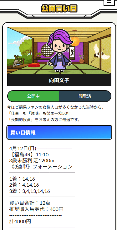 向田文子プランは、派手さより「頭のズラし方」がうまい口コミにしたくなる情報でした。1番人気をきっちり相手に残しながら、勝ち馬は9番人気で持ってきて、さらに3着は3番人気でまとめて配当総額18万5960円。こういうのって、人気薄を拾ったと言っても無茶な穴狙いには見えないんですよね。ちゃんと来るところを残しながら、いちばん配当になる場所だけズラしてるから、買い目そのものに説得力がある。向田文子プランは、競馬に詳しくない人が見ても「なんか上手そう」と感じるし、競馬が好きな人が見れば「これは馬券取捨がうまい」となるタイプだと思いました。