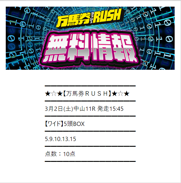 今月中旬の安定モード2日連続不的中会員だよ!過去の的中は2ヶ月無敗だったのに購入した途端に2日連続6鞍ゼンメツ〜。ここで購入=不的中連立方程式と未購入=的中連立方程式が成立しました〜。予想買い目がカスリもせんかった!自分未購入以降は的中しまくりっ!出来レースっ!!あ〜腹立つ!!!