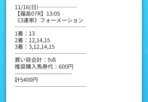 前日の福島2Rに続き、11/16福島7Rもバイアスナビを購入。ここが本当にヤバかった…。結果は13-14-15で3連単158,940円。フォーメーション9点×1点600円=5,400円の勝負で、払戻は953,640円とミリオン目前。2日連続でこのレベルの配当を引きずり出すのは、もはや“偶然”では片づけられません。トリガミ覚悟で広げるのではなく、「当てにいきながらも配当を最大化する配置」になっていて、本物のプロ集団だと感じました。